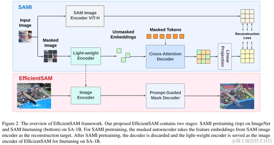 EfficientSAM 包含两个阶段:1)在 ImageNet 上对 SAMI 进行预训练(上);2)在 SA-1B 上微调 SAM(下)。