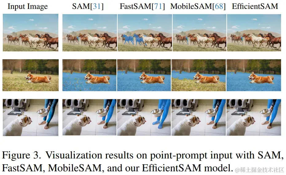 而且,EfficientSAM 比 FastSAM 轻得多,efficientSAM-Ti 的参数为 9.8M,而 FastSAM 的参数为 68M。