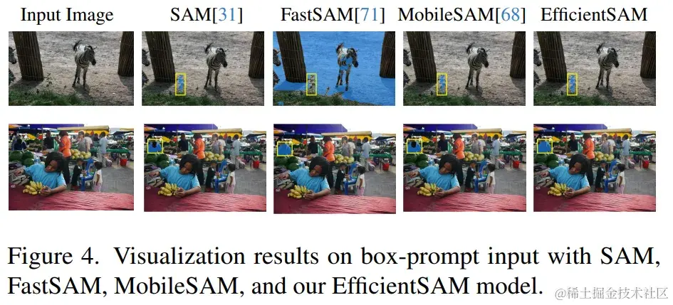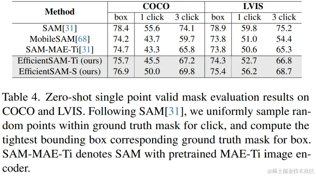表 4 将 EfficientSAMs 与 SAM、MobileSAM 和 SAM-MAE-Ti 进行比较。在 COCO 上,EfficientSAM-Ti 的性能优于 MobileSAM。EfficientSAM-Ti 具有 SAMI 预训练权重,也比 MAE 预训练权重表现更好。