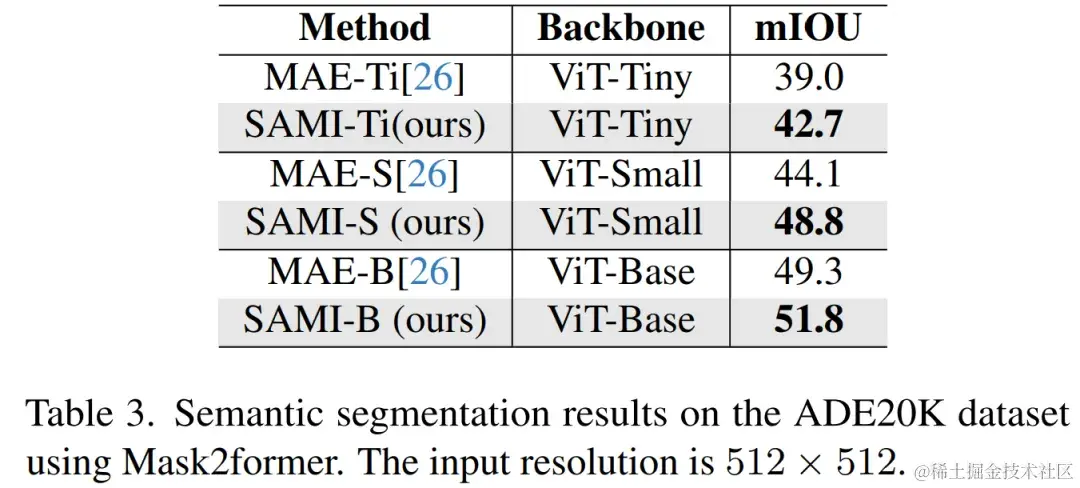 语义分割。本文进一步将预训练主干扩展到语义分割任务,以评估其有效性。结果如表 3 所示,使用 SAMI 预训练主干网的 Mask2former 在 ImageNet-1K 上比使用 MAE 预训练的主干网实现了更好的 mIoU。这些实验结果验证了本文提出的技术可以很好地泛化到各种下游任务。