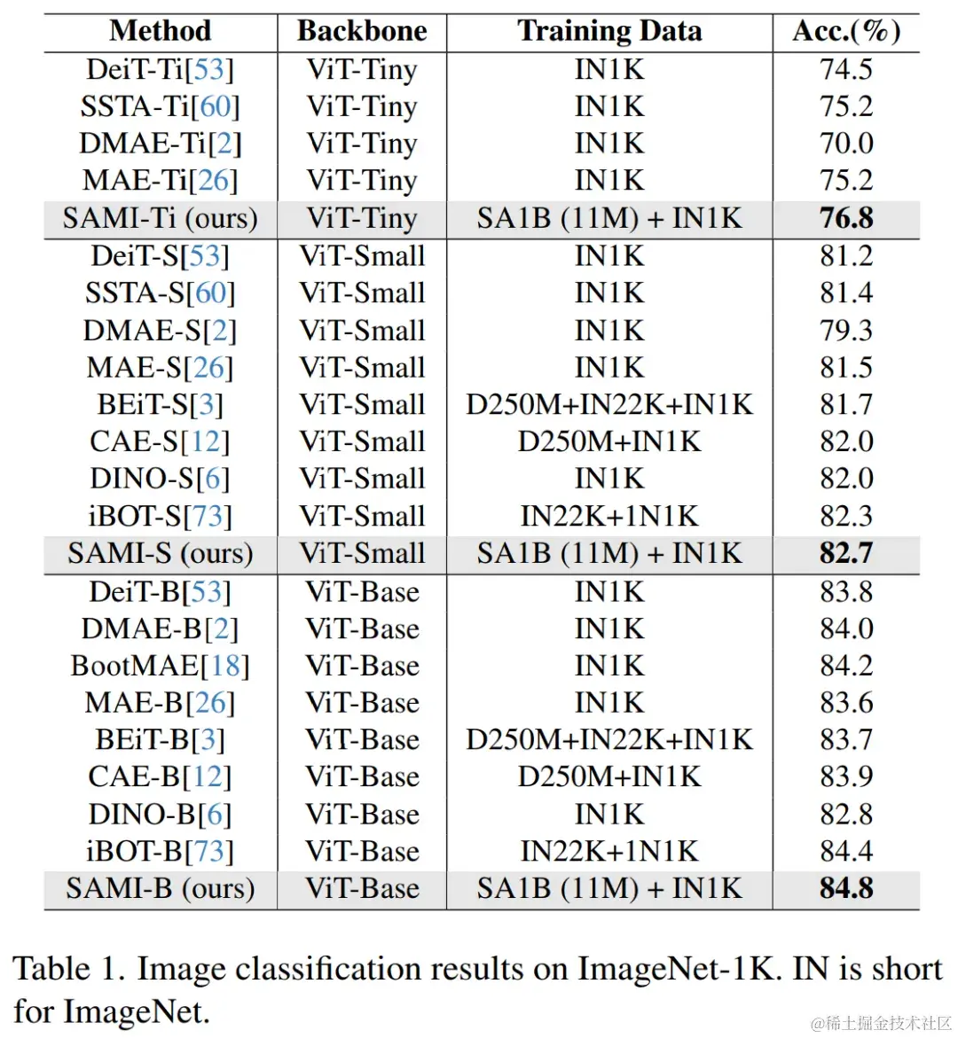 如表 1 将 SAMI 与 MAE、iBOT、CAE 和 BEiT 等预训练方法以及 DeiT 和 SSTA 等蒸馏方法进行了比较。