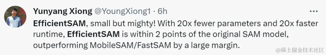 论文作者 Yunyang Xiong 表示:本文提出的 EfficientSAM 参数减少了 20 倍,但运行时间快了 20 倍,只与原始 SAM 模型的差距在 2 个百分点以内,大大优于 MobileSAM/FastSAM。