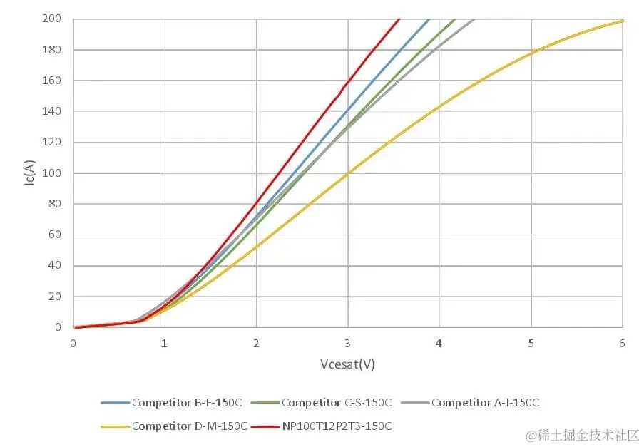 导通损耗是整体损耗的重要组成部分,我们选取了在市场上广泛应用的不同厂商ABCD产品作为对照,在同样的条件如高温150°C,VGE=15V 时,从图4的对比,我们可以读出在额定电流100A条件下,竞品A,B,C,D的 Vcesat的饱和压降分别为2.49V, 2.41V, 2.52V, 3V。红色的是安世 IGBT 产品NP100T12P2T3的饱和压降,Vcesat 仅为2.27V,在高温下,和竞品ABCD相比,Vcesat 分别降低了10%,6%,11%,32%。极大的降低 IGBT 的静态损耗。Nexperia 的 IGBT模块表现出了优异的低 Vcesat 饱和压降的特性。