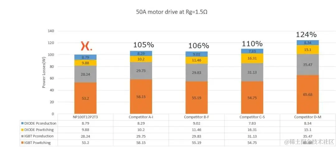 仿真损耗的计算结果如下,在典型变频器驱动器应用条件下,Nexperia NP100T12P2T3 的 IGBT 产品, 其开关损耗和导通损耗均小于竞品 ABCD ,总功率损耗降低5%~24%。Nexperia 的 IGBT 产品整体降低了功率损耗,提升了变频器的系统效率。