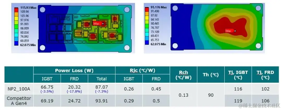 从热仿真上可以直观的看到节温的分布,如图8所示。对比安世半导体和竞品 A 马达驱动应用做热仿真,Nexperia 的 IGBT 最高节温 Tjmax 会是116°C, 竞品的最高节温 Tjmax 是119°C,比竞品 A 低3°C。