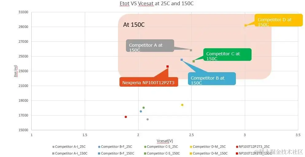 图6是在常温25°C 和高温150°C 时的开关损耗Etot和导通压降 Vcesat 的折中关系对比。IGBT工作在大电流高电压,高温150°C的折中曲线备受客户的关注。如图6所示,横坐标代表的是导通压降 Vcesat ,纵坐标代表的是开关损耗 Etot 越接近原点,意外着损耗越低,可以看出,Nexperia IGBT产品的开关损耗和饱和压降都明显小于竞品 ABCD 。