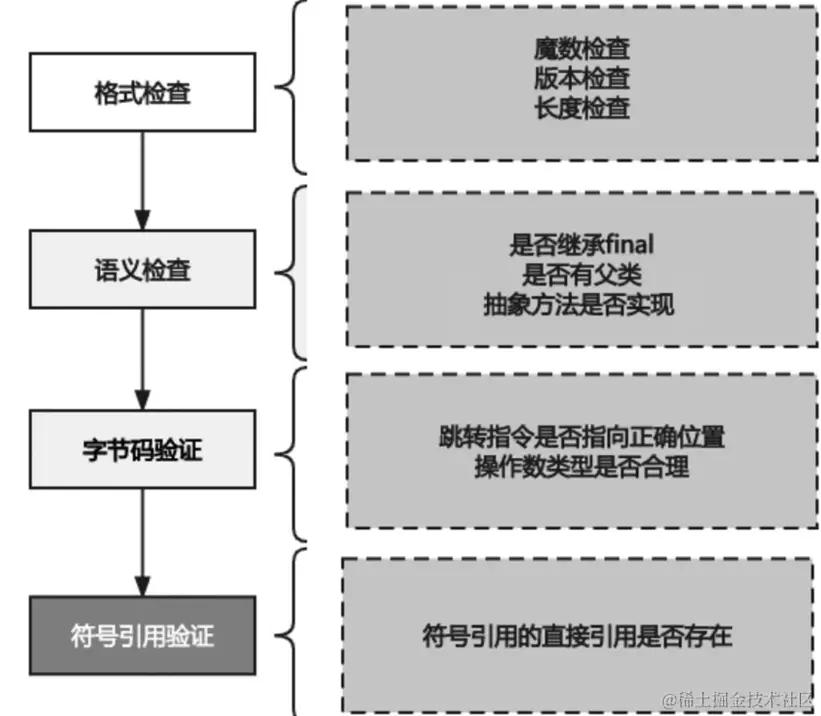 最后一个阶段的校验行为发生在虚拟机将符号引用转化为直接引用的时候,这个转化动作将在连接的第三阶段——解析阶段中发生。