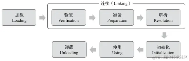 一个类型从被加载到虚拟机内存开始,到卸载出内存为止,它的整个生命周期将会经历加载 loading、验证、准备、解析、初始化、使用 和 卸载七个阶段,其中验证、准备、解析三个部分统称为连接。