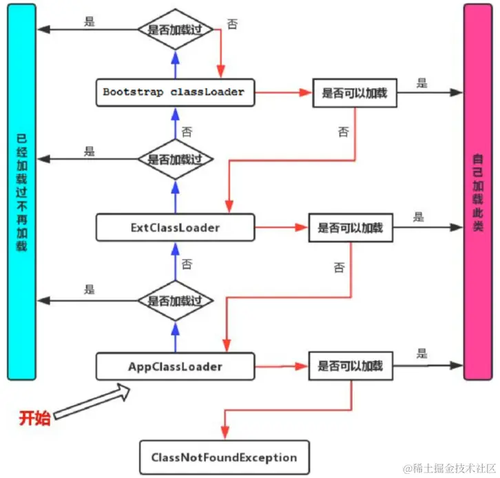 如果一个类加载器在接到加载类的请求时,它首先不会自己尝试去加载这个类,而是把这个请求任务委托给父类加载器去完成,依次递归,如果父类加载器可以完成类加载任务,就成功返回。只有父类加载器无法完成此加载任务时,才自己去加载。