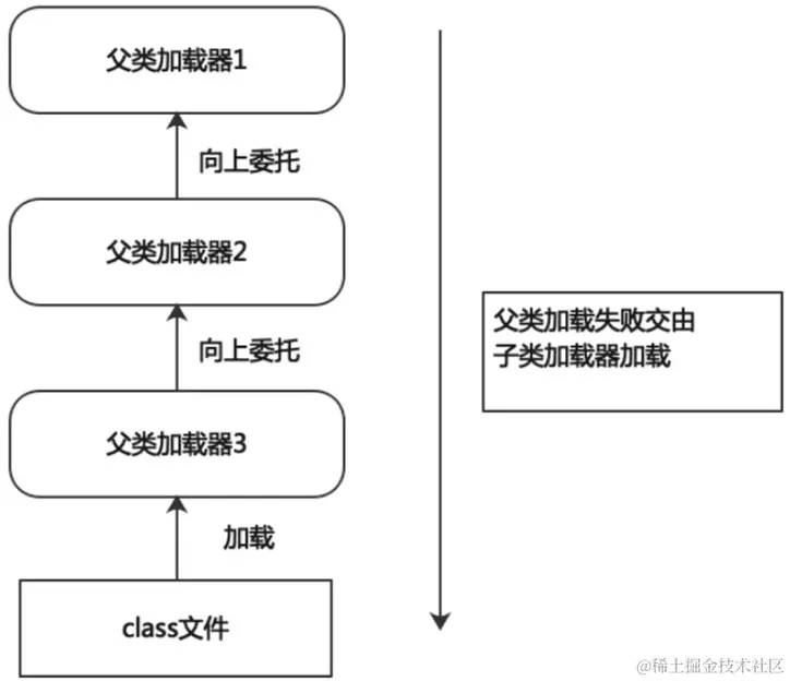 2、若没有加载,则调用父加载器的 loadClass() 方法进行加载