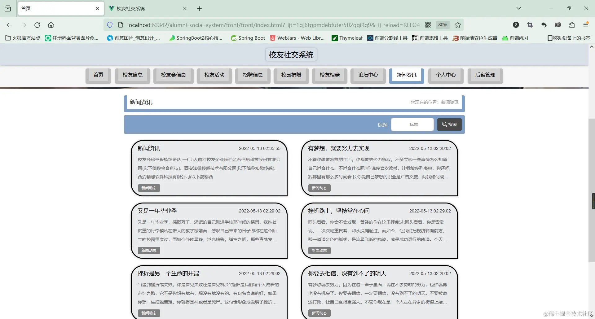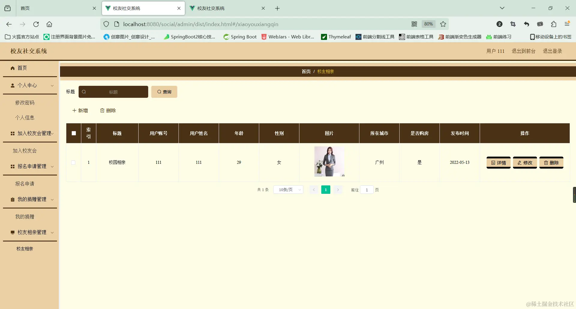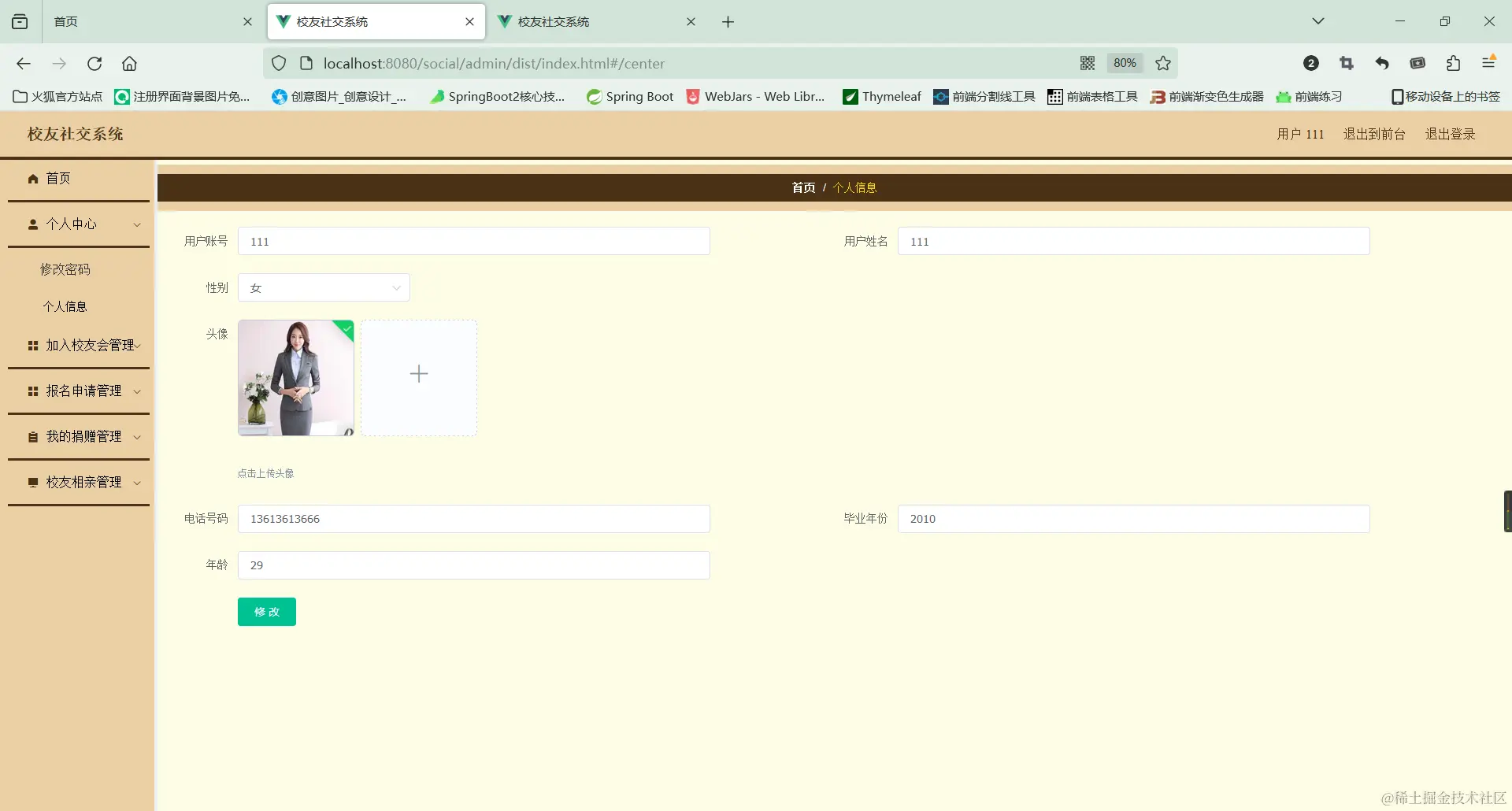 基于SpringBoot的校友社交系统,通过这个系统能够满足管理员和用户的校友社交信息管理功能。系统的主要功能包括首页、个人中心、用户管理、校友信息管理、校友会信息管理、加入校友会管理、活动类型管理、校友活动管理、报名申请管理、岗位管理、招聘信息管理、项目管理、校园捐赠管理、我的捐赠管理、校友相亲管理、论坛中心、系统管理等功能