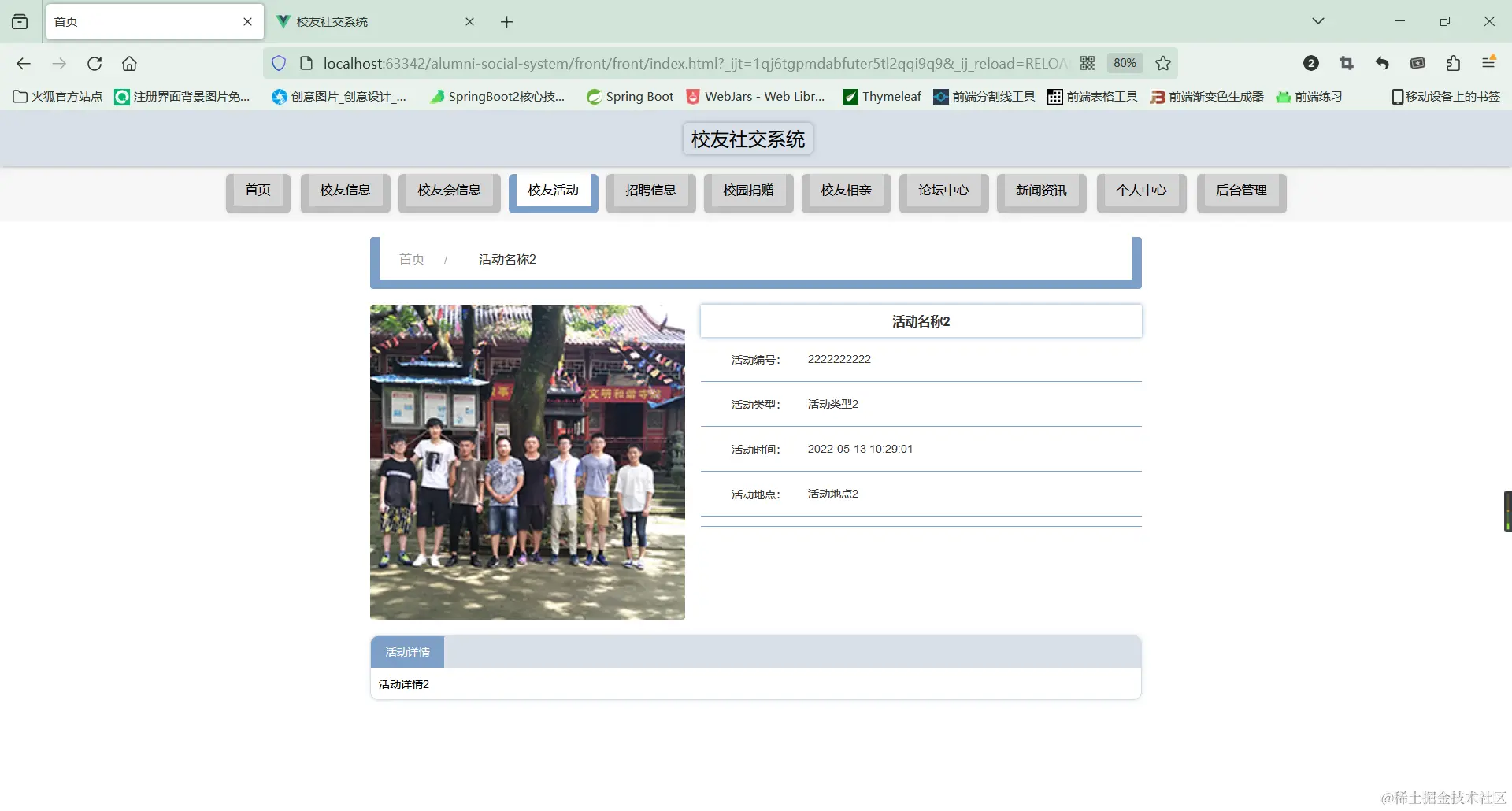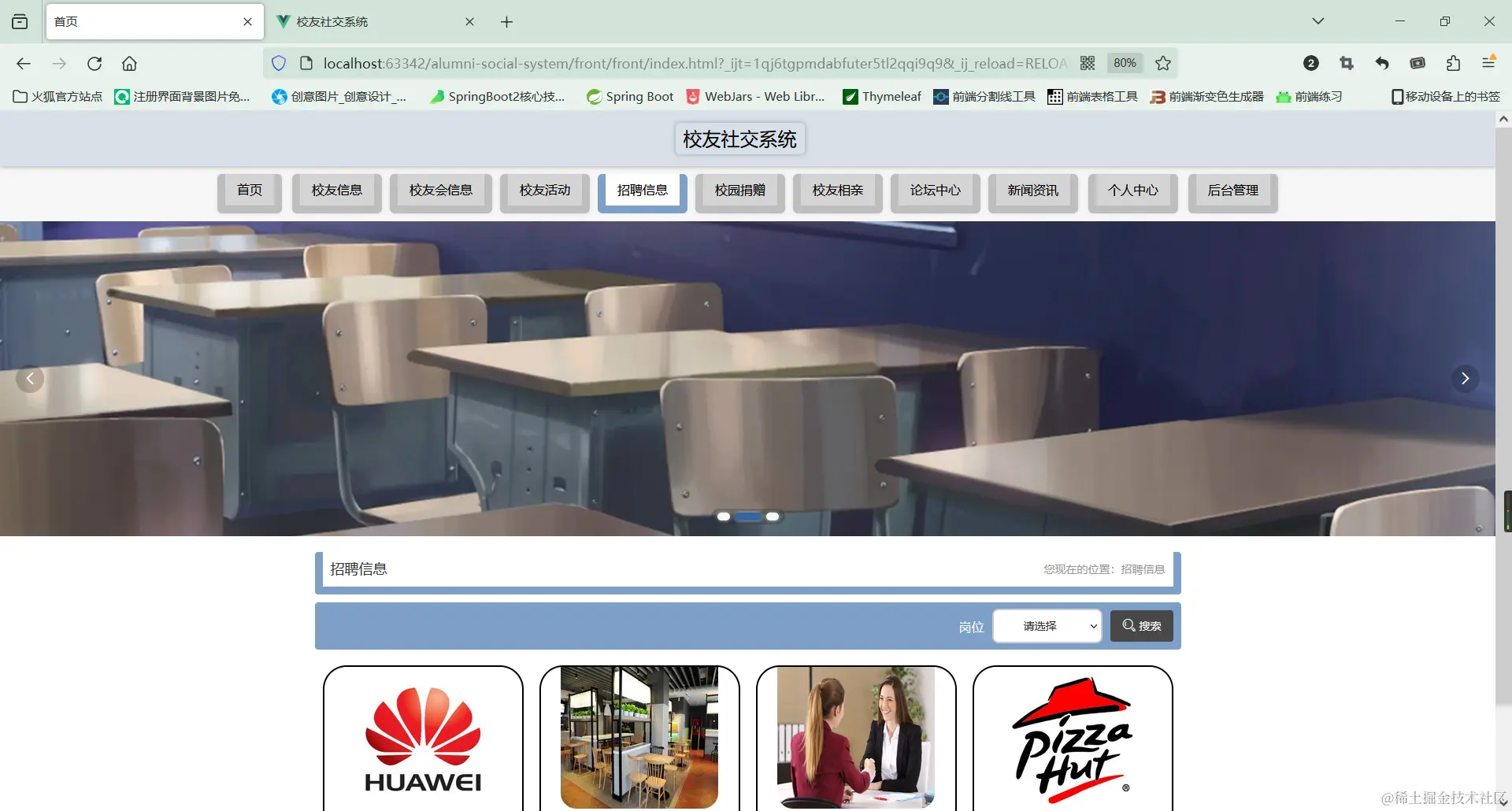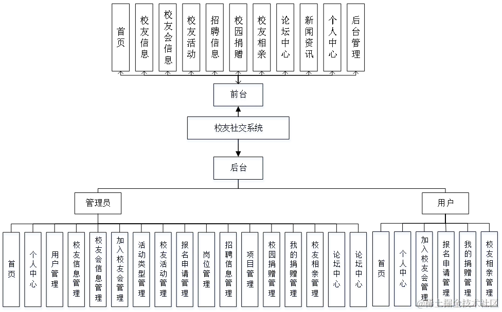 基于SpringBoot的校友社交系统,通过这个系统能够满足管理员和用户的校友社交信息管理功能。系统的主要功能包括首页、个人中心、用户管理、校友信息管理、校友会信息管理、加入校友会管理、活动类型管理、校友活动管理、报名申请管理、岗位管理、招聘信息管理、项目管理、校园捐赠管理、我的捐赠管理、校友相亲管理、论坛中心、系统管理等功能