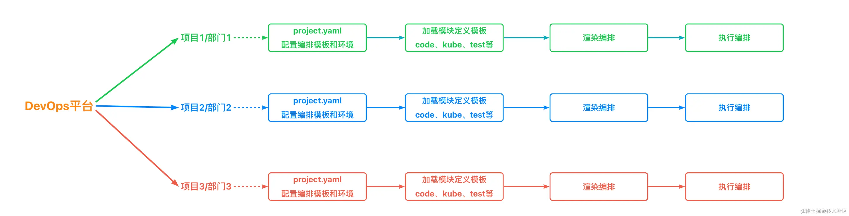 说明:不同颜色:表示不同项目/部门的整条链路都要差异处理,即各模板的定义、结构和实现都存在差异。