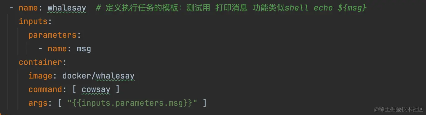 - name: whalesay # 定义执行任务的模板:测试用 打印消息 功能类似shell echo ${msg}