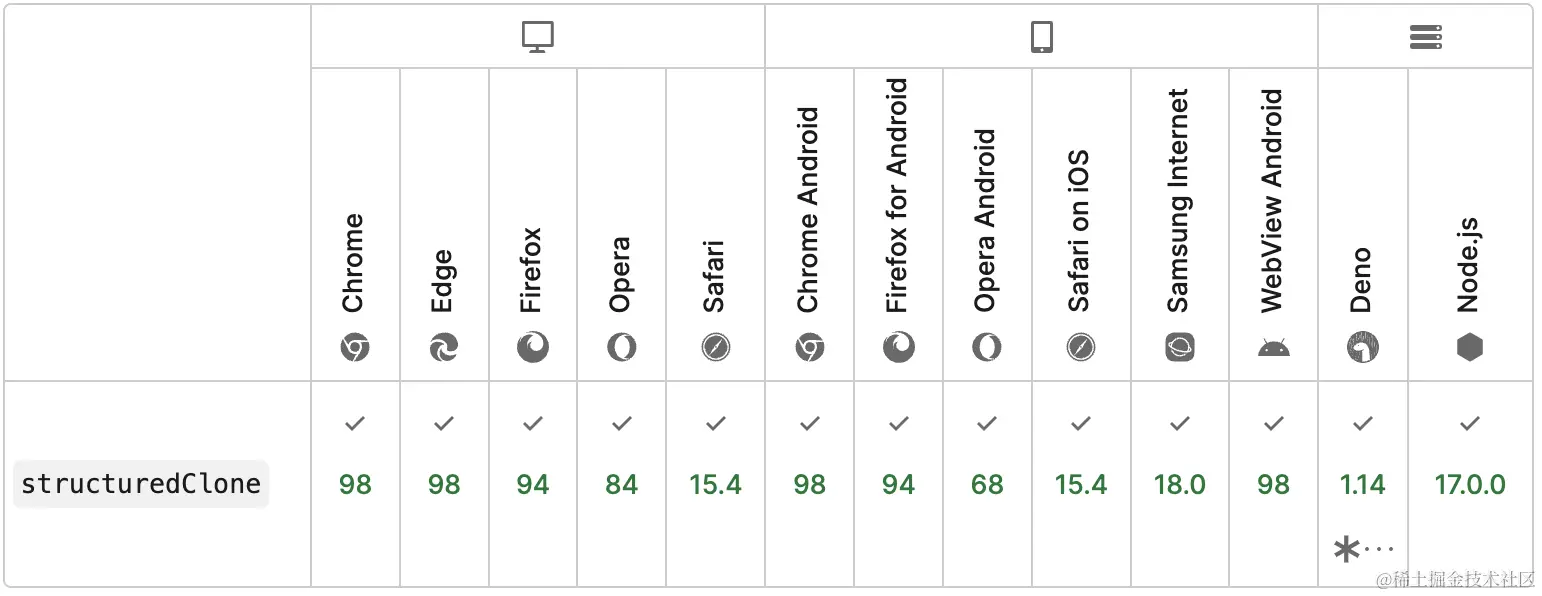 值得庆幸的是 structuredClone 在所有主流浏览器中都受支持,也支持Node.js和Deno。