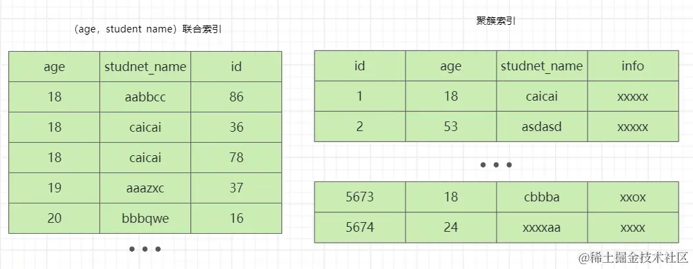 二级索引中记录则只存储age、student_name、id的信息,并以age、student_name、id的顺序升序排序