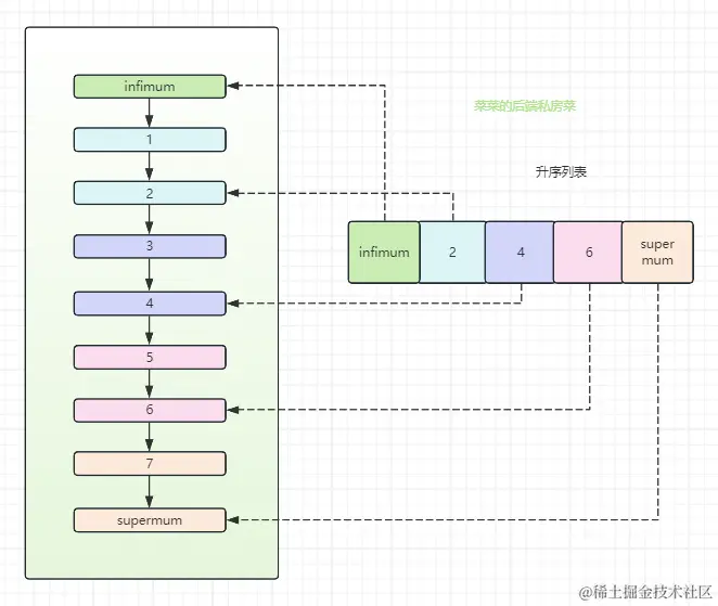 图中不同颜色的记录为不同的组,每个组的最大值维护成升序列表(infimum,2,4,6,supermum)