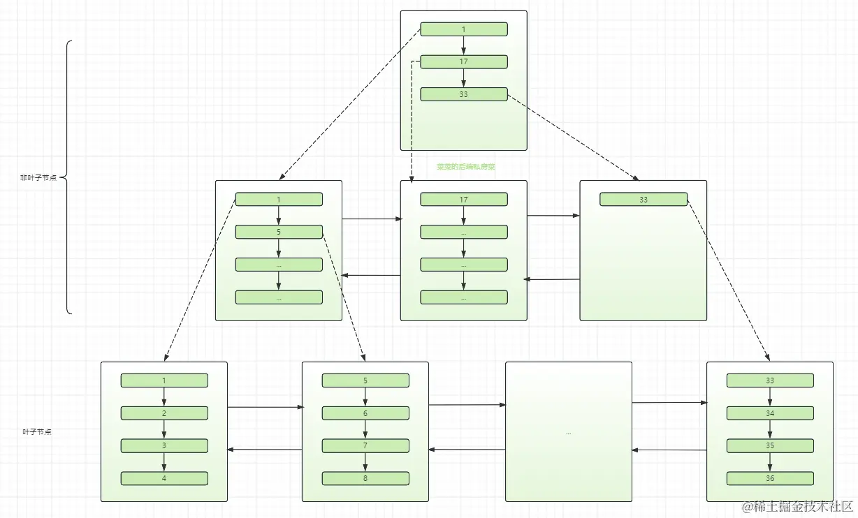 当查询时会从根节点(非叶子节点)一步一步查询到叶子节点
