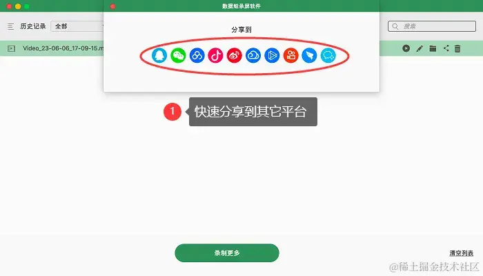 第4步:此外,在历史记录页面中,我们还可以找到之前录制过的视频,快速将视频分享到其它媒体平台。