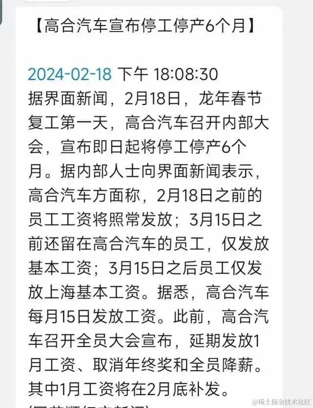 2024春节后开工第一天,新势力汽车中的高合汽车召开内部大会,宣布从2月18日起停工停产6个月,员工工资延期发放。