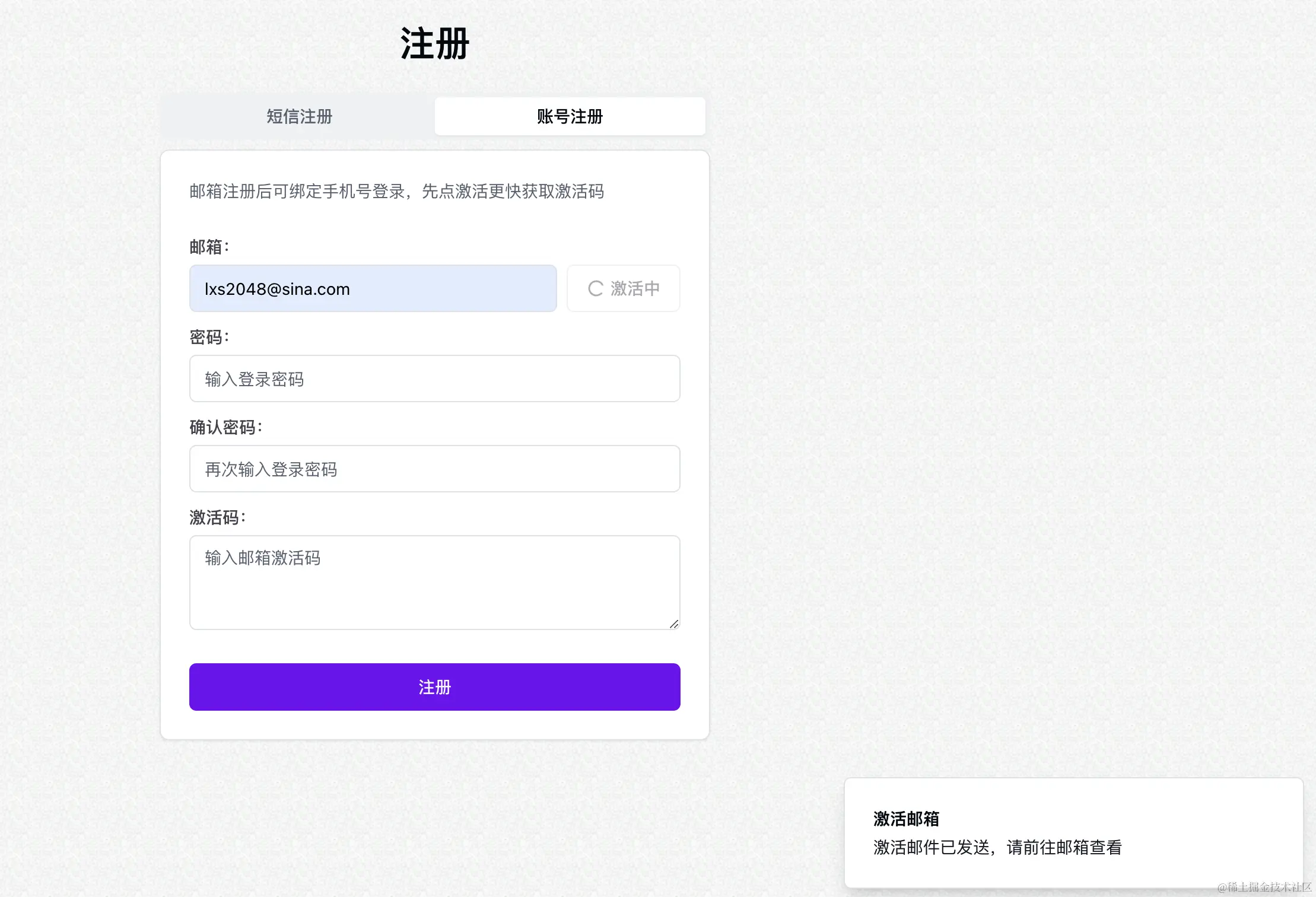 前文中我们定义了两个表,分别是user和activateToken,我们实现注册要使用两种方式,一种是短信注册,一种是账号注册,账号注册需要验证邮箱的真伪,注册账号前发送到邮箱一个code,表activate存储邮箱账号和code,提交注册时验证code,创建账号完成注册,短信注册同理,最终页面效果如图