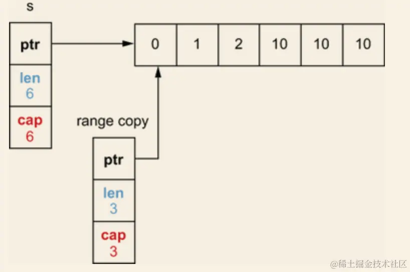 - 截断操作or直接赋值后底层会共用一个数组,直到其中一个发生扩容。