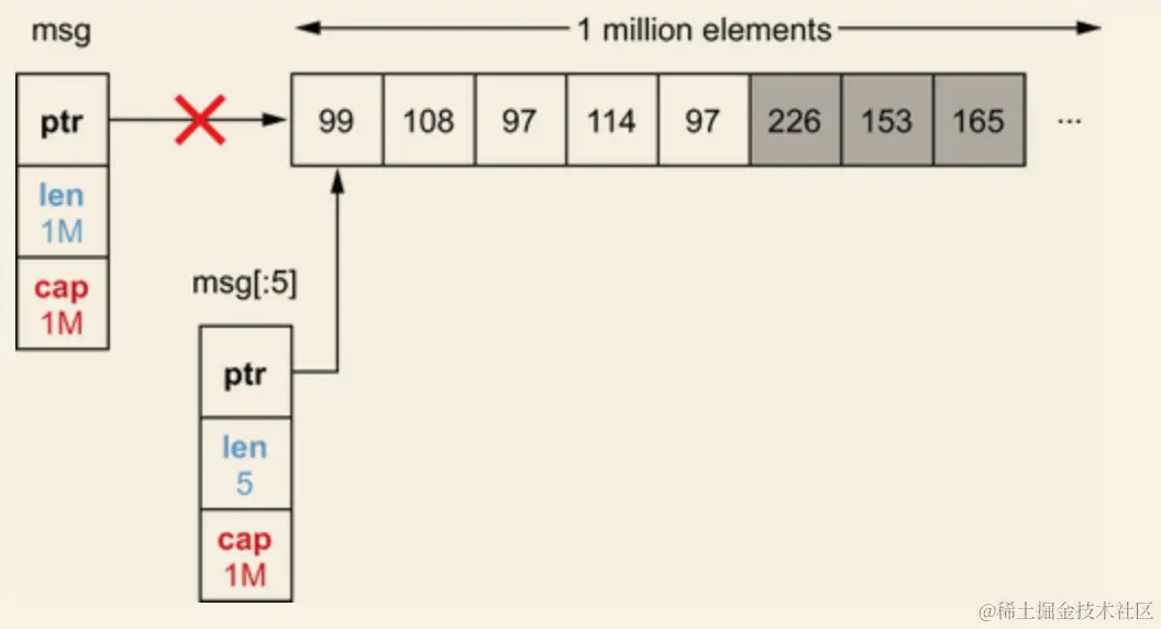 初始化的msg数组长度为1_000_000_000,取前5个元素返回。如果仍然保持msg[:5]的引用,会导致后面的所有元素都无法回收。