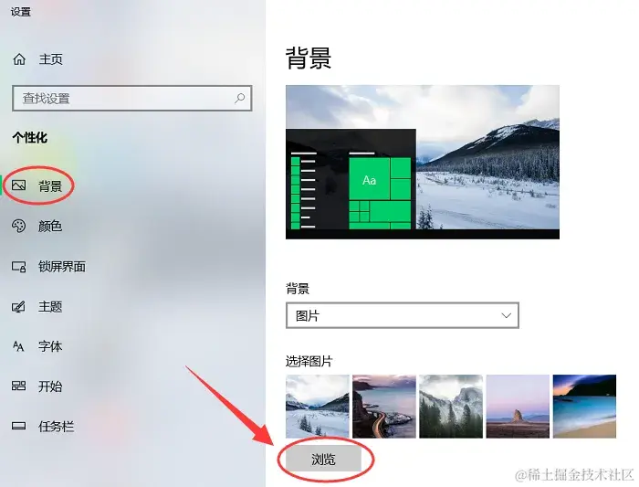 步骤3:进入个性化设置后,点击 【背景】 选项。选择喜欢的图片或颜色作为桌面壁纸。