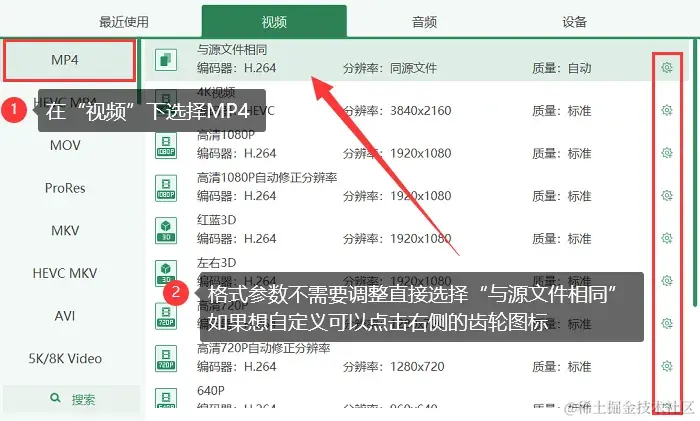 从左侧列表中选择 【MP4】 作为输出格式。您还可以点击 【齿轮图标】 根据需要选择分辨率和其他参数。