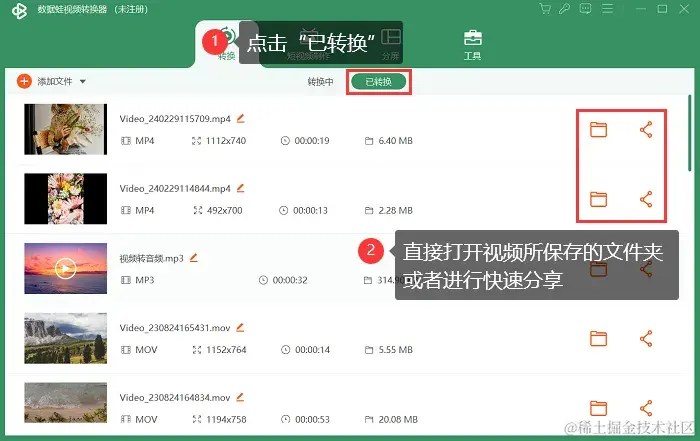 转换完成后,您可以在软件界面的 【已完成】 选项卡中找到转换后的MP4文件。点击文件夹,可以查看或播放转换后的视频,也可以点击分享图标,分享到其他平台。
