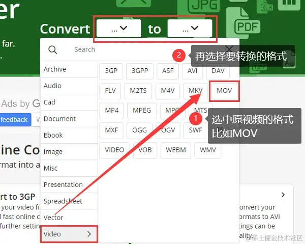 在网页打开Online Video Converter在线转换工具,在 【Convert…to…】 设置原视频的格式以及需要转换的格式。