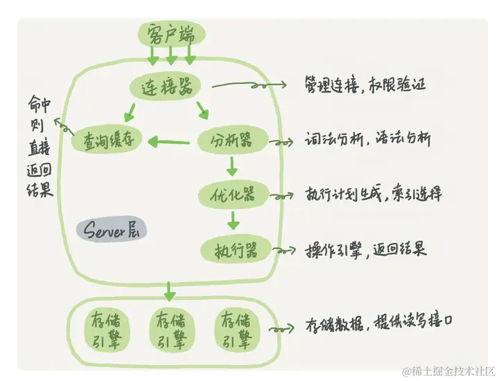 server层分为连接器,查询缓存,分析器,优化器,执行器。核心服务基本都在这层,不同存储引擎共用同一个server层。