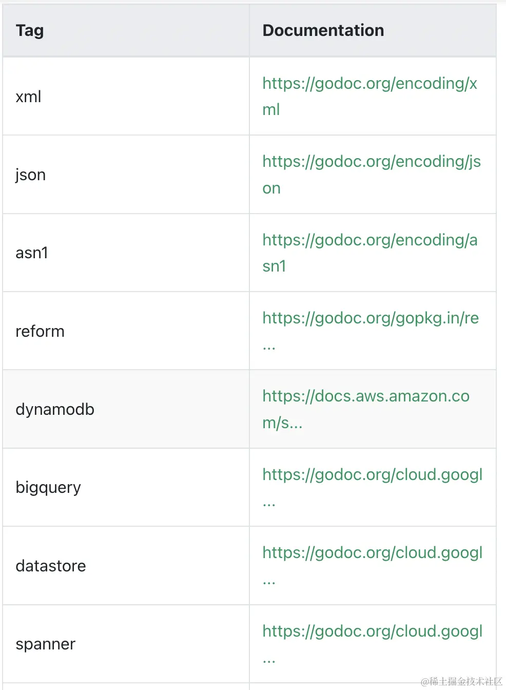 Go提供了可通过发射发现的结构体标签,这些在标签库json/xml中得到了广泛的使用,orm框架也支持了结构体标签,上面的这个例子就是因为encoding/json支持json结构体标签,每种标签都有自己的特殊规则