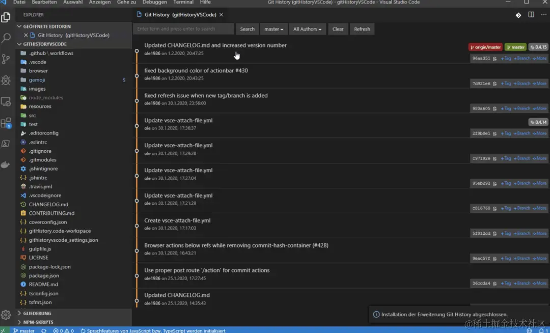 Git History 是一个VS Code插件,增强了Git 的功能,它可以用来查看日志信息,查看和搜索历史,进行分支对比、提交对比,跨提交对比文件等。