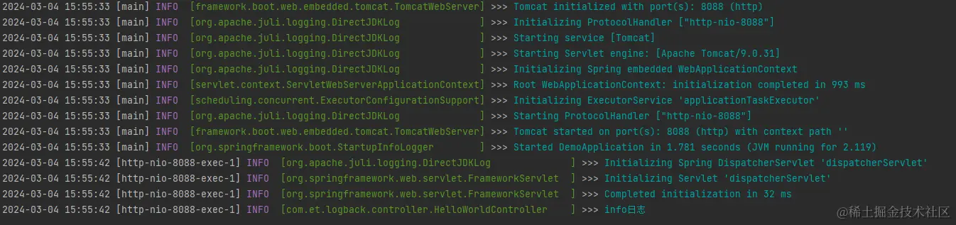 启动springboot应用,查看控制台日志,打印彩色日志。如下图所示: