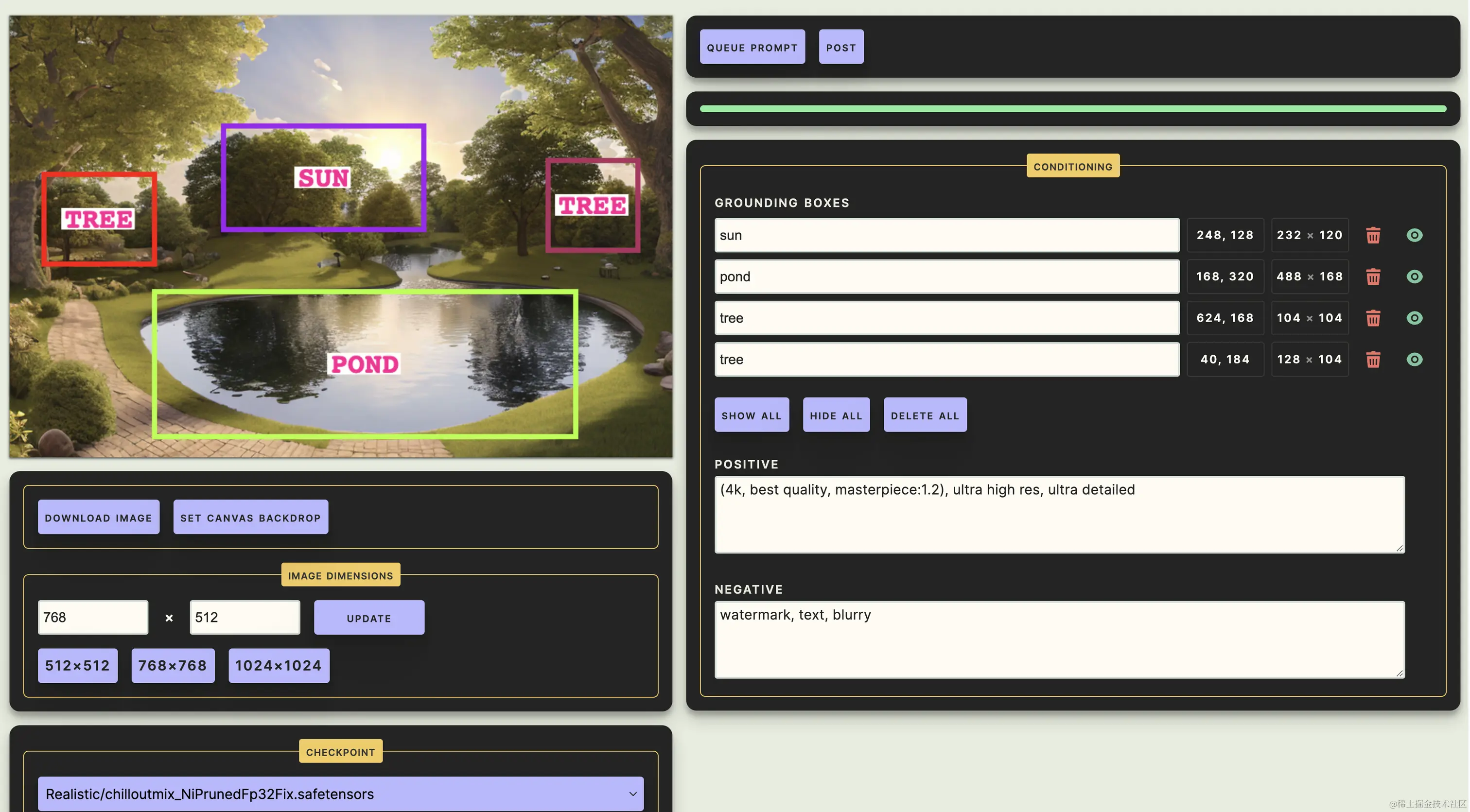 gligen可以将文本描述限制在指定的精确位置内,组合来控制图片区域内生成的元素,达到比较精准控制生成图片的能力。对于一些常见的元素限制的还可以,但是如果指定的元素对于模型比较陌生,最终生成的效果并不理想。