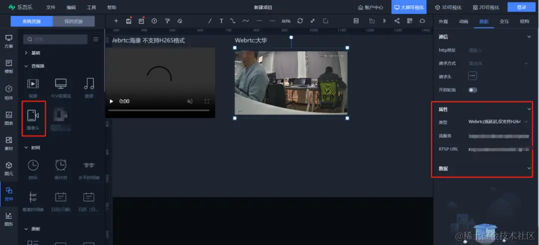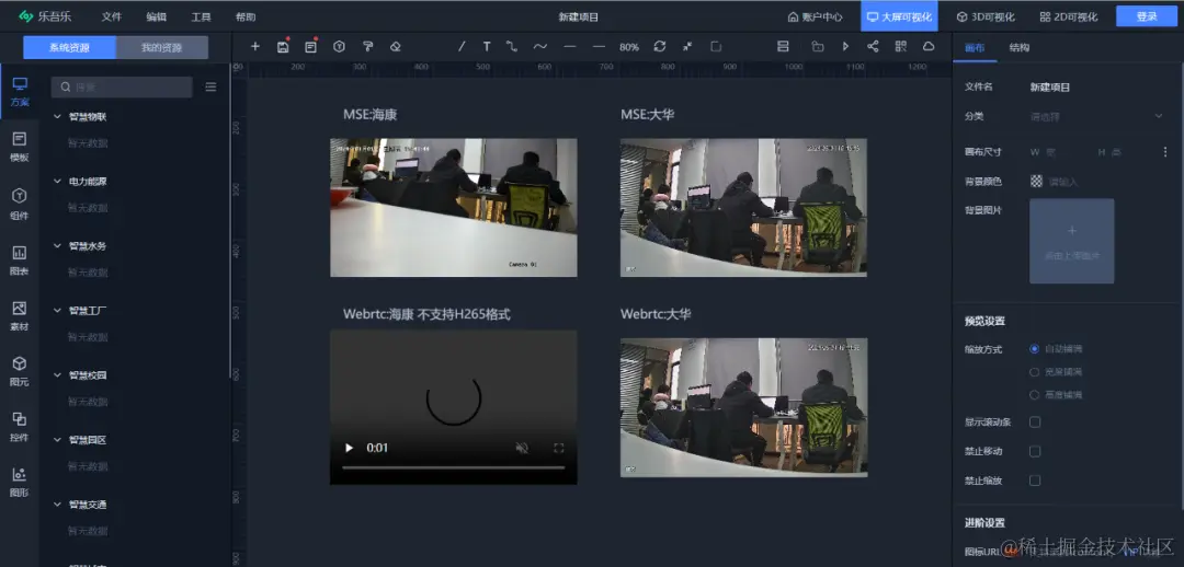 乐吾乐 Web可视化平台推出了新的摄像头播放组件,简单易用,延迟低、消耗小、稳定可靠,一次性解决播放不同厂商品牌摄像头,欢迎大家使用。