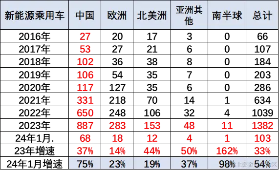 2024 年 1 月中国新能源车出口超强,在东南亚和欧洲市场表现很好,这也是中国产业链强大,形成强大的国内市场和出口的双增长。2023 年 1-12 月份,世界汽车销量 8901 万台,其中新能车汽车销量 1429 万台,燃油车销量总占比相对下降。