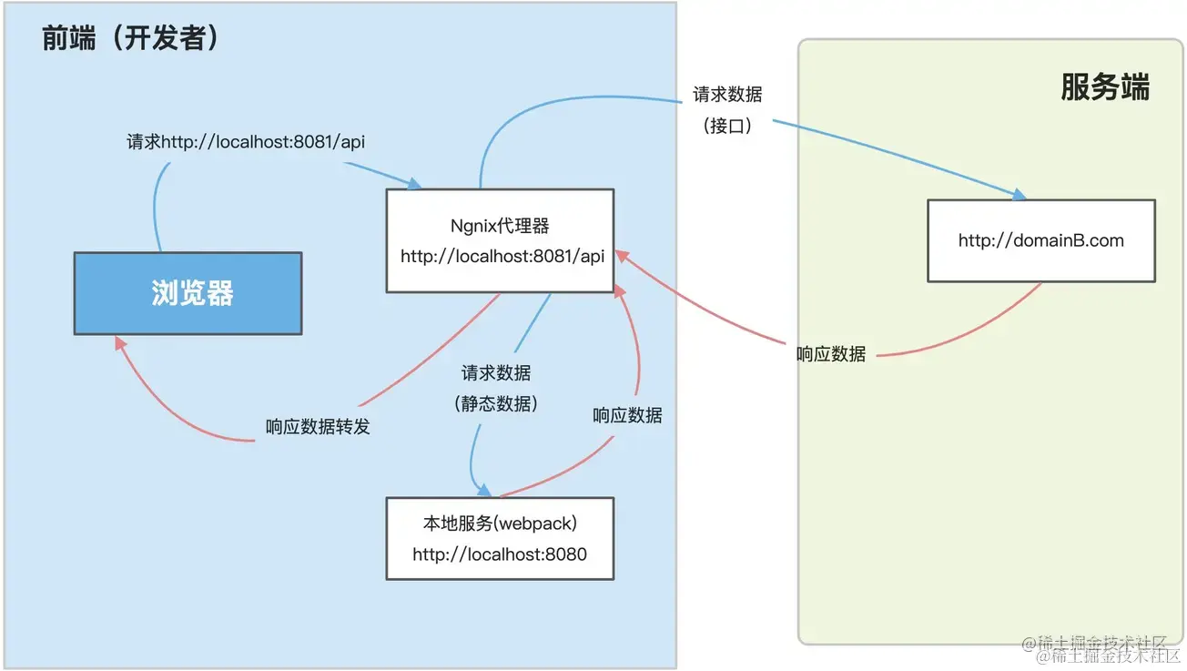 比如webpack启动的本地服务,端口号是8080,也就是localhost://8080,而这个地址不能跟服务端domain.com互通(因为跨域)。可以通过ngnix配置: