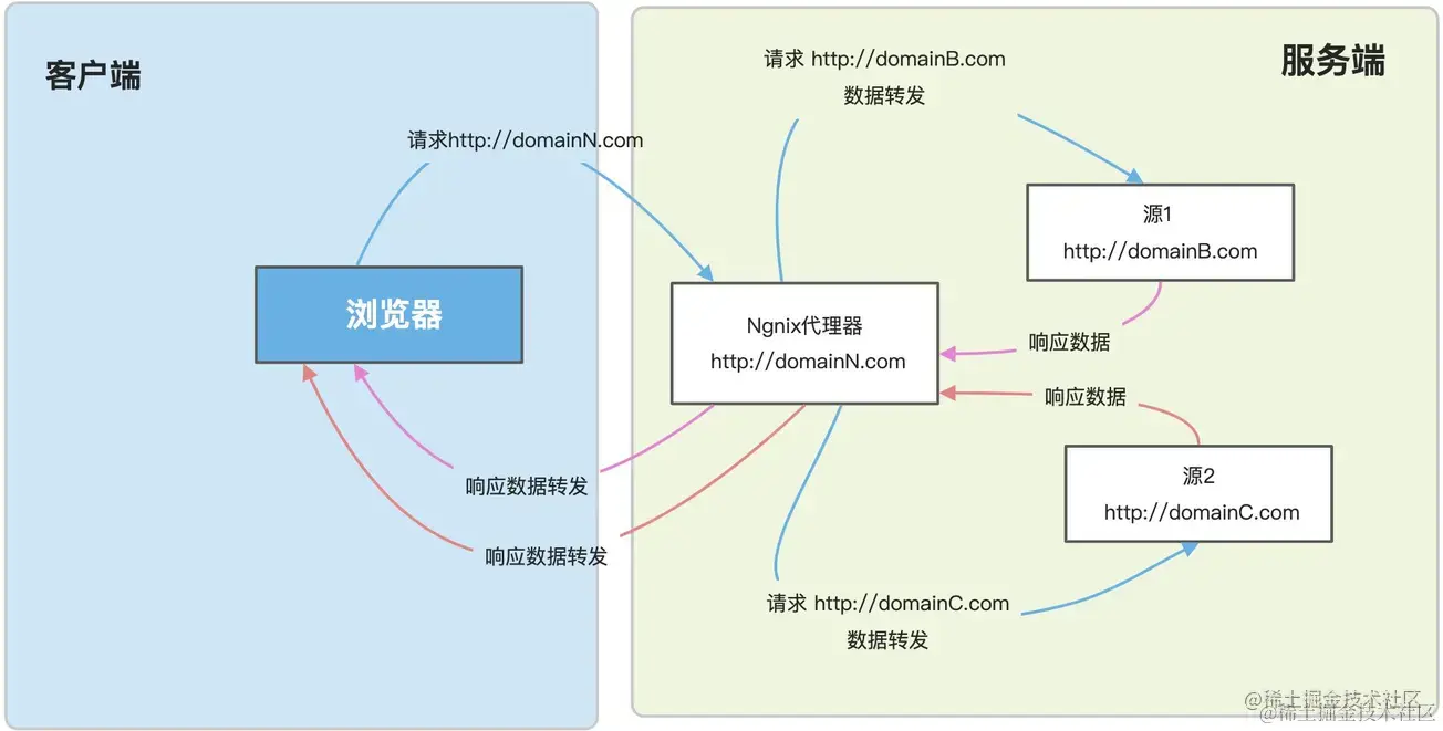 实现原理:同源策略是浏览器需要遵循的标准,而如果是服务器向服务器请求就无需遵循同源策略 。 代理服务器主要实现了转发浏览器请求和转发服务器的响应。