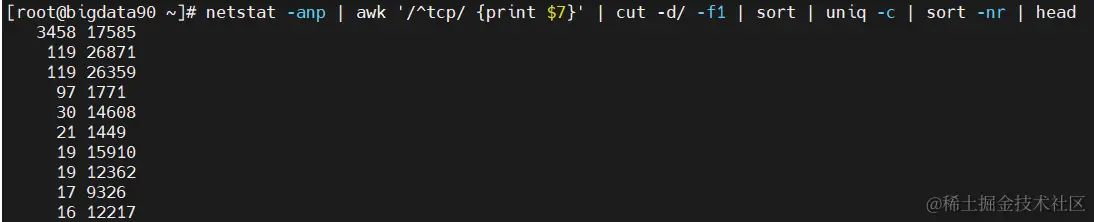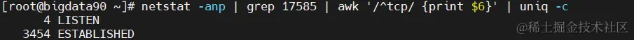 命令是:netstat -anp | grep 12345 | awk '/^tcp/ {print $6}' | uniq -c