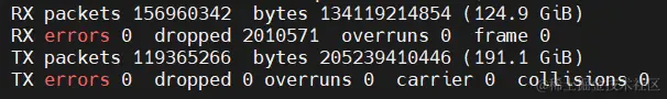 分别表示接收和发送的网络包数目,其中包含了drop关键字,也就是丢包的数量,这里可看到是2010571,这种就需要确认下网络是否有拥塞或其他异常。