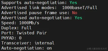 使用ethtool 网卡名获取,网卡名使用上面的命令可以得到!