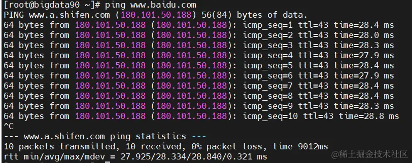 图中首先可以看到网络是否联通。其次,可以直观看出现在的延迟,例如上图都是20多毫秒,这个延迟已经很高了。数据中心内部一般不到1毫秒,我这里是ping的一个外部网络。 再然后,通过最后一行的统计信息,可以看到网络抖动非常小,只有0.321毫秒,因此该网络虽然慢,但慢得很稳定很均匀。 最后,丢包率,这里直接看到是0% packet loss,你可以测试更长时间观察是否丢包。