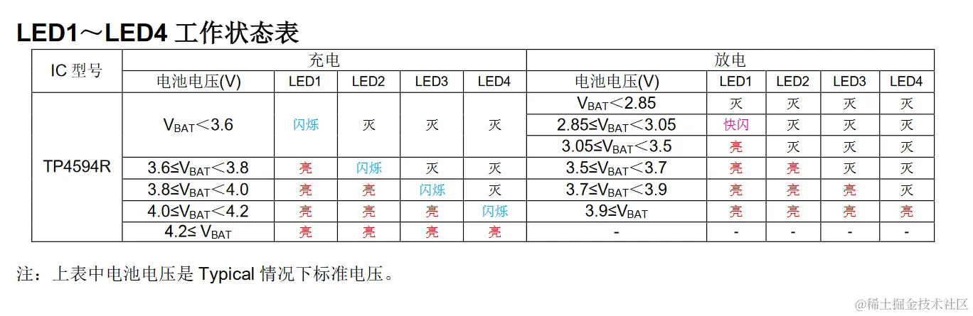 LED1~LED4 为充放电状态与电量指示引脚,不同状况时 LED 状态如下: