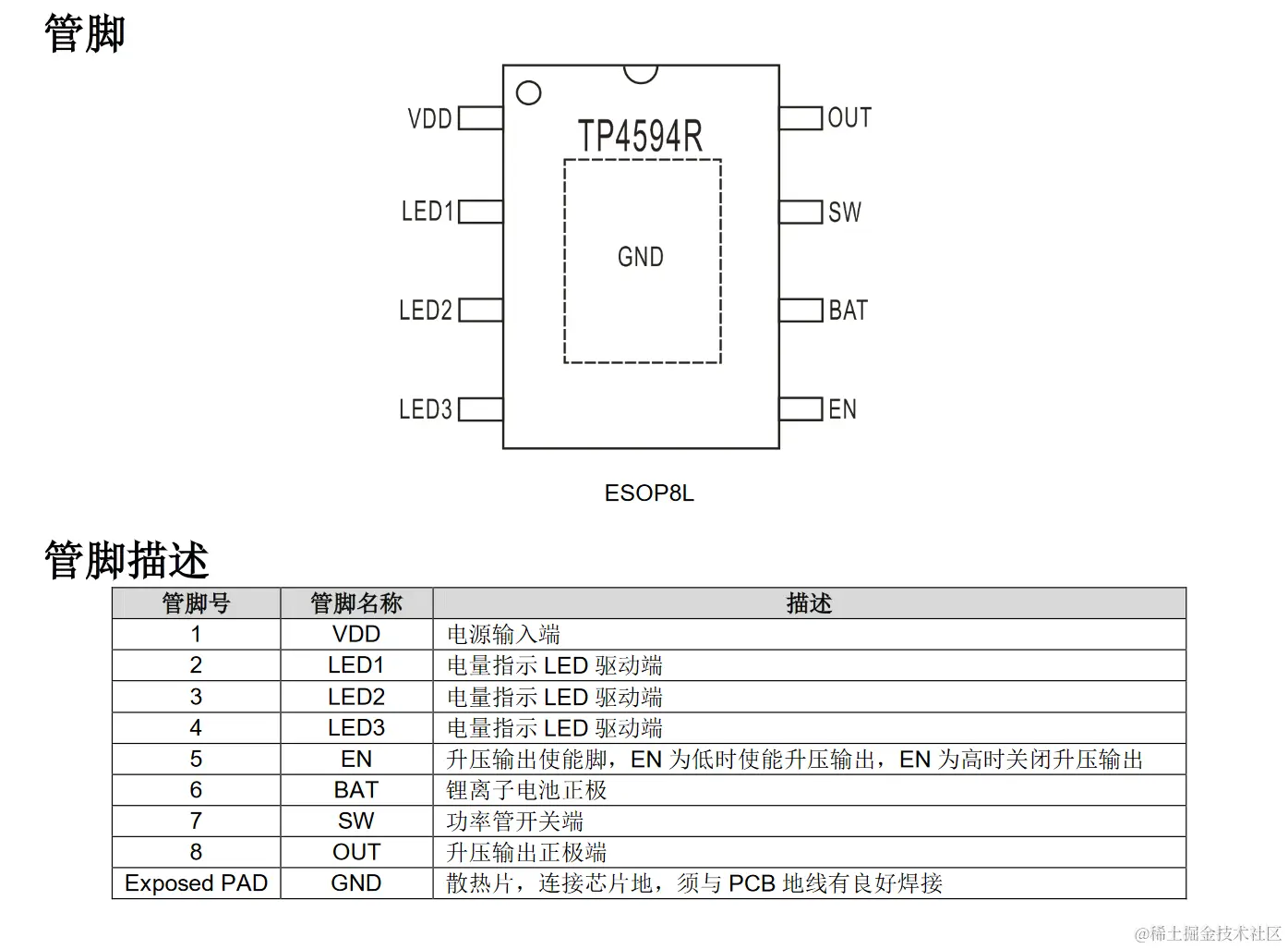 TP4594R 内部集成了线性充电管理模块、同步升压放电管理模块、电量检测与 LED 指示模块、保护模块。TP4594R内置充电与放电功率 MOS,充电电流为 250mA,最大同步升压输出电流为 500mA。