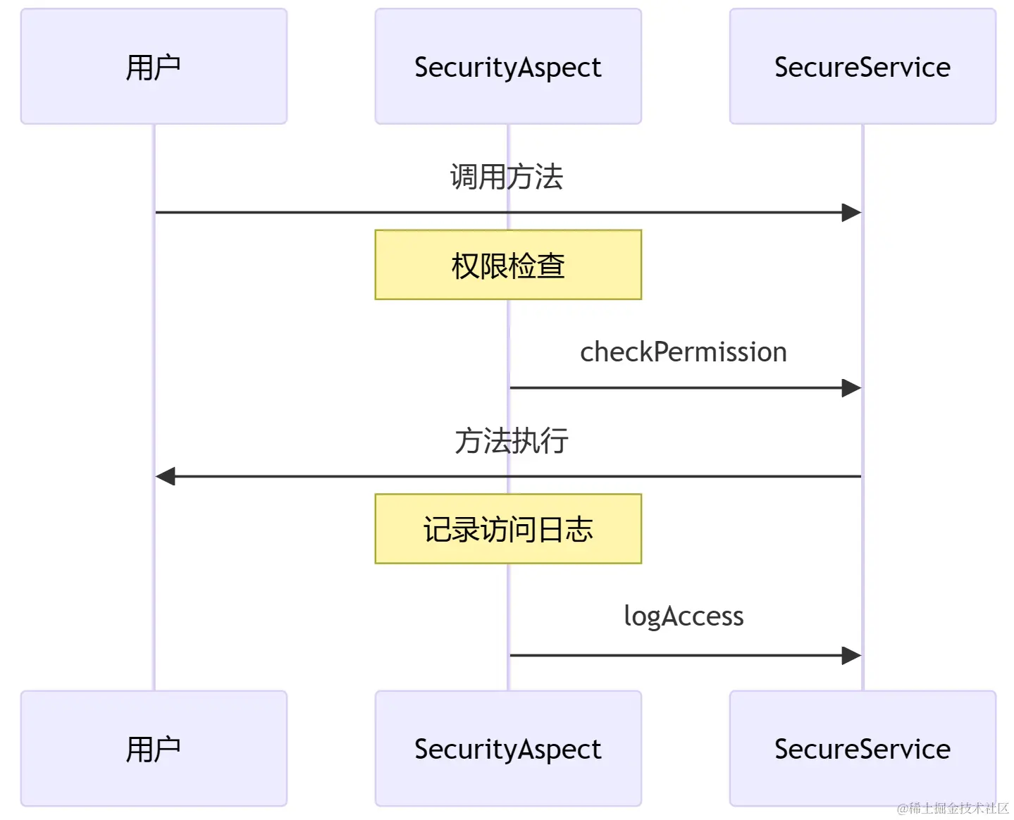 假设咱们需要在用户访问某些资源前进行权限检查,并在访问后记录访问日志。这是一个典型的使用前置通知和后置通知的场景。