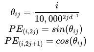 其中 PE 是位置嵌入矩阵,i 是沿着标记的数量,j 是沿着标记的长度,d 是标记长度。代码实现: