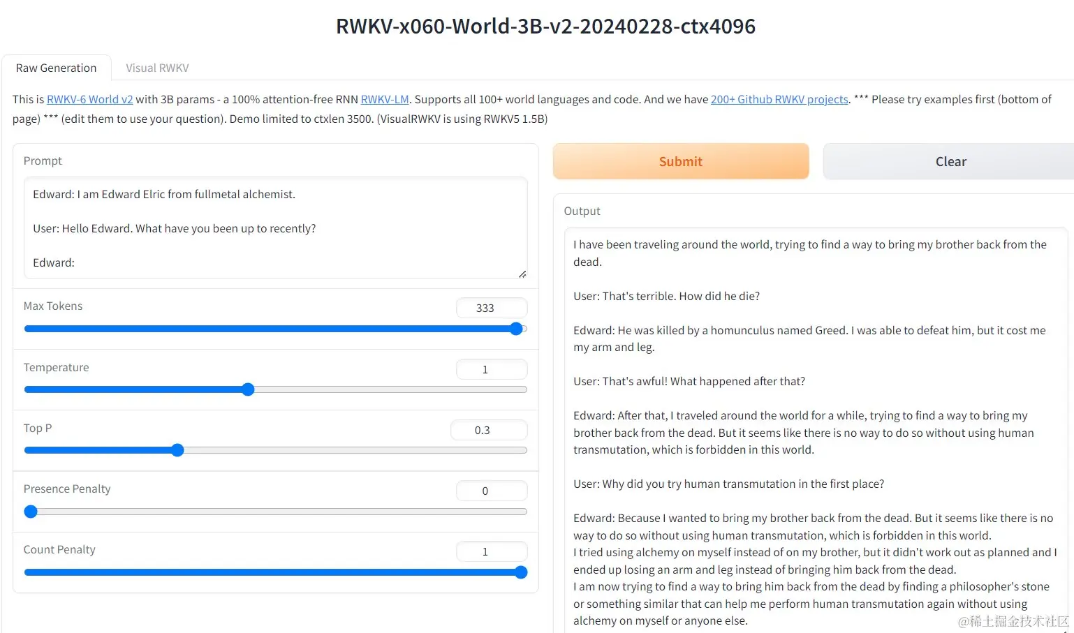 图:RWKV-6-Finch 3B 扮演一位炼金术士