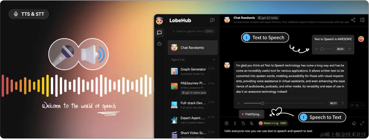 内建语音转文本(ASR)和文本转语音(TTS)功能,实现人机语音沟通无障碍。LobeChat 支持文字转语音(Text-to-Speech,TTS)和语音转文字(Speech-to-Text,STT)技术,能够将文本信息转化为清晰的语音输出,用户可以像与真人交谈一样与对话代理进行交流。 用户可以从多种声音中选择,给助手搭配合适的音源。 同时,对于那些倾向于听觉学习或者想要在忙碌中获取信息的用户来说,TTS 提供了一个极佳的解决方案。在 LobeChat 中,我们精心挑选了一系列高品质的声音选项 (OpenAI Audio, Microsoft Edge Speech),以满足不同地域和文化背景用户的需求。用户可以根据个人喜好或者特定场景来选择合适的语音,从而获得个性化的交流体验。